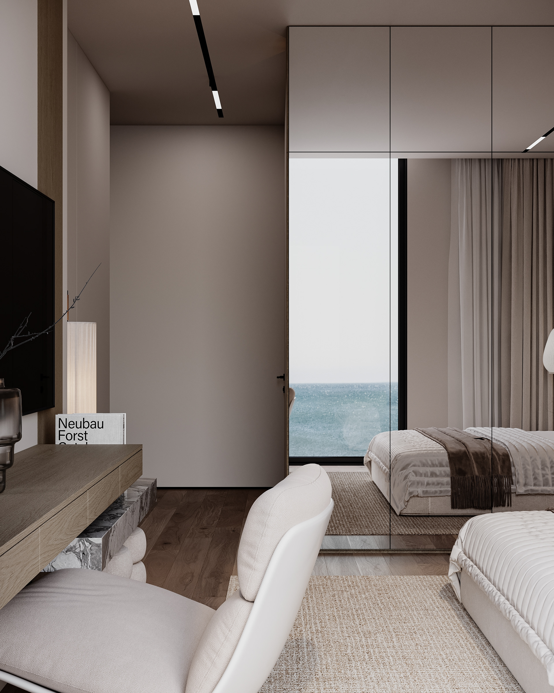 Despite the compact 23 sq.m. layout, the space integrates a full-height mirrored wardrobe, a multifunctional TV and workspace unit, and custom lighting elements. The sea-facing floor-to-ceiling glazing adds a subtle sense of openness and connection to the landscape.